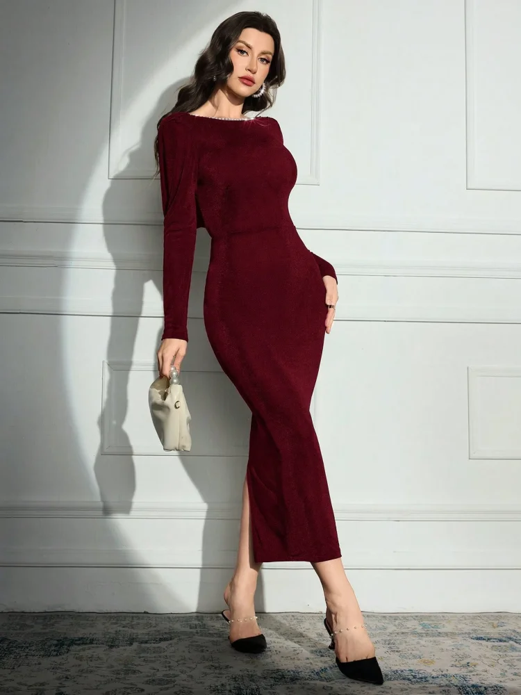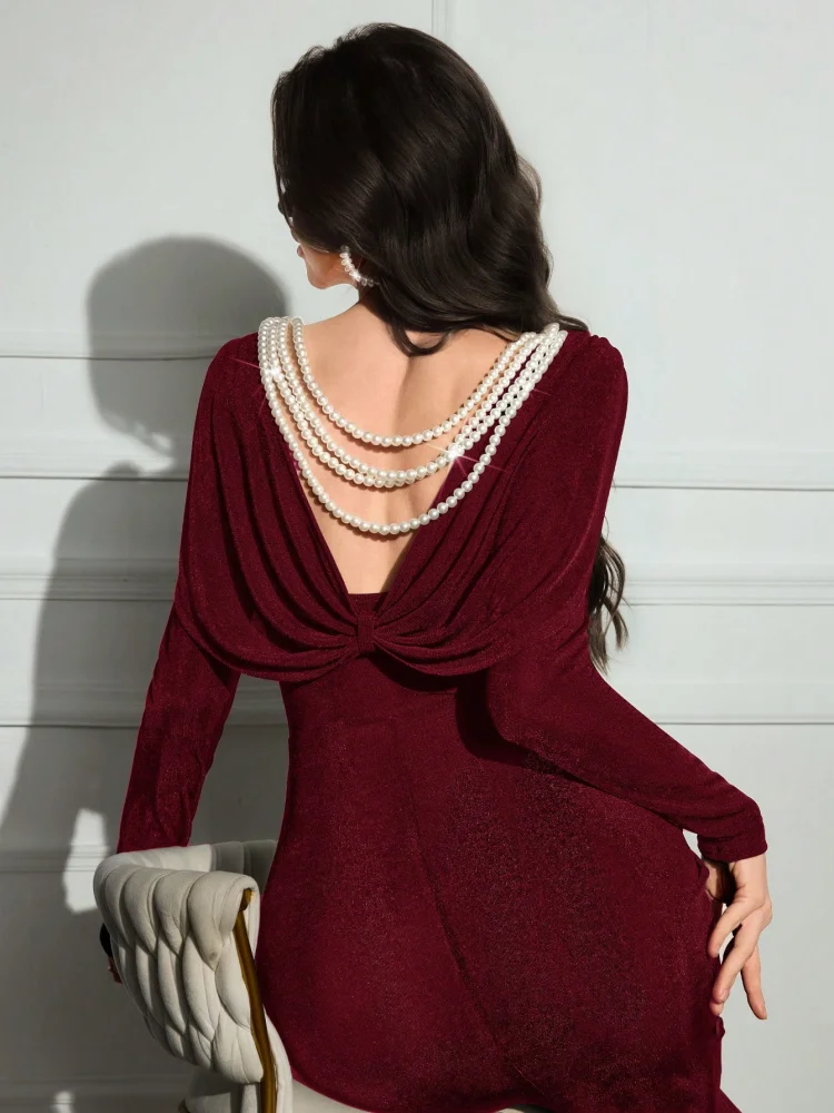 فستان أنيق مصنوع من القماش المقلد مزين باللؤلؤ وأكمام طويلة