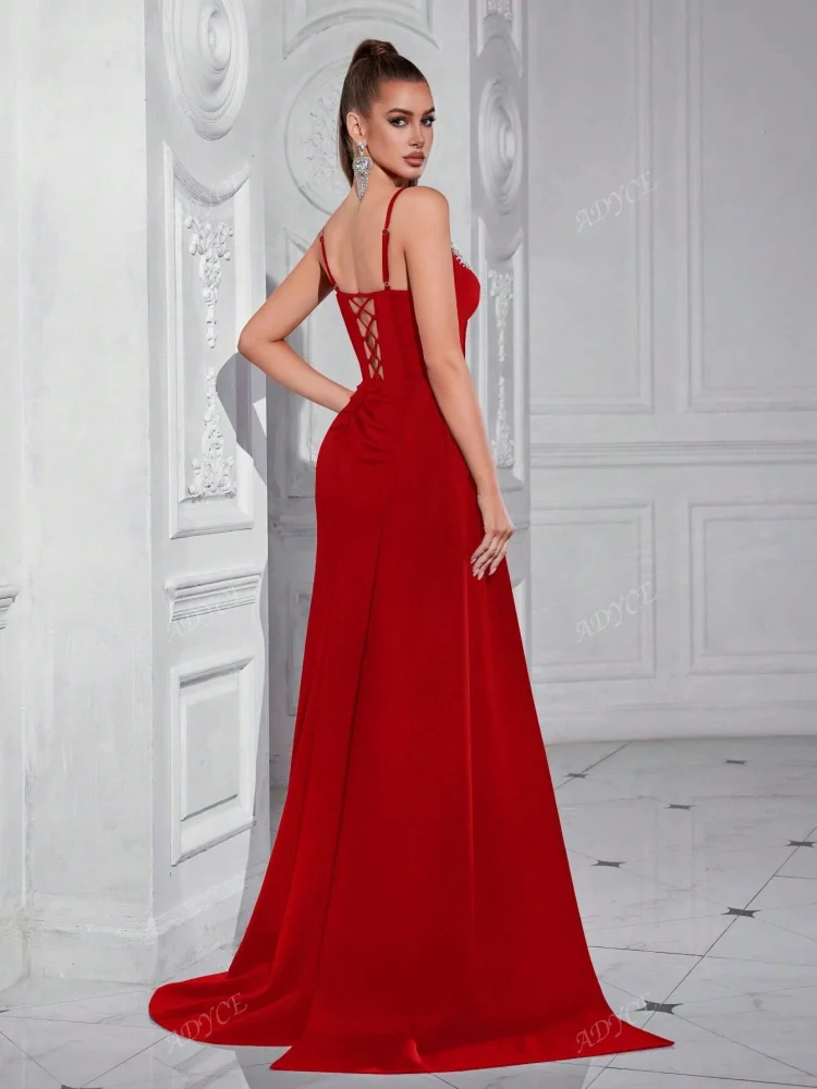 فستان طويل مخمل مزين بالراين ستون ذو فتحة خلفية وخصر عالي للنساء، فستان سهرة رسمي لحفلات الزفاف