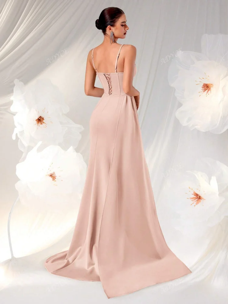 فستان طويل مخمل مزين بالراين ستون ذو فتحة خلفية وخصر عالي للنساء، فستان سهرة رسمي لحفلات الزفاف